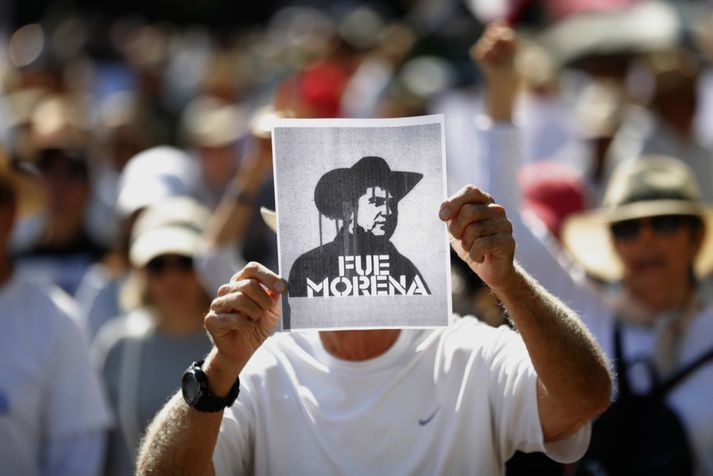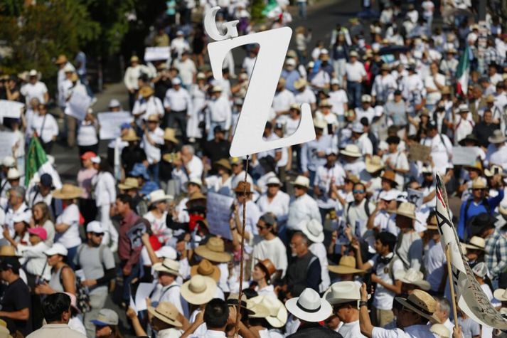 Í frétt Guardian segir að mótmælin hafi verið skipulögð af ungu fólki, meðlimum Z-kynslóðar, en hafi endað með stuðningi þeirrar eldri líka. Sheinbaum hefur sagt mótmælin skipulögð af hægrisinnuðum andstæðingum hennar. „Í margar klukkustundir fór þessi samkoma friðsamlega fram þar til hópur grímuklæddra einstaklinga hóf að beita ofbeldi,“ er haft eftir Pablo Vázquez, öryggismálastjóra Mexíkóborgar, í frétt Guardian. Hann segir um hundrað lögreglumenn hafa slasast í mótmælunum. Af þeim hafi 40 þurft að leita á spítala vegna marbletta og skurða. Alls slösuðust einnig um tuttugu mótmælendur. Meðlimir Z-kynslóðar mótmæltu í Mexíkó-borg. Yfirleitt er talað um að Z-kynslóðin sé fædd frá 1997 til 2012.Vísir/EPA Sheinbaum, sem tók við völdum í október 2024, nýtur mikils stuðnings í Mexíkó en hefur sætt gagnrýni undanfarið í tengslum við nokkur morð sem hafa vakið mikla athygli. Í frétt Guardian segir að mótmælendur hafi haldið á borðum og borið hatta til heiðurs Carlos Alberto Manzo Rodríguez, bæjarstjóra Uruapan í Michoacán-fylki, sem var myrtur 1. nóvember eftir að hafa farið í átak gegn gengjum sem selja fíkniefni. Í frétt BBC segir að Manzo hafi gert kröfu um aðgerðir gegn fíkniefnagengjum. „Hann var drepinn vegna þess að hann var maður sem sendi lögreglumenn upp í fjöllin til að berjast við glæpamenn,“ segir hin 65 ára gamla fasteignasala Rosa Maria Avila, sem hafði ferðast frá Michoacán-fylki til að taka þátt í mótmælunum. Generation Z marches against Mexican president Sheinbaum and violence in Mexico epa12528688 A person holds a sign which states 'was a brunette' during a protest in Guadalajara, Mexico, 15 November 2025. Amid flags and chants of 'Claudia (Sheinbaum) out!', hundreds of Mexicans protested to express their 'political fatigue' with the government led by the Mexican president and denounce the 'impunity' in the face of the violence plaguing the country. EPA/Francisco Guasco „Við þurfum meira öryggi,“ segir Andres Massa, 29 ára viðskiptaráðgjafi, sem bar sjóræningjafána með hauskúpu sem er orðið alþjóðlegt tákn mótmæla Z-kynslóðarinnar. Mótmælendur söfnuðust saman fyrir framan höllina þar sem Sheinbaum býr og starfar, og brutu niður málmgirðingar í kringum höllina. Lögregla notaði táragas til að halda mótmælum í skefjum. „Svona hefðuð þið átt að vernda Carlos Manzo,“ hrópuðu sumir mótmælendanna að lögreglunni og köstuðu einnig hlutum í hana. Vill ekki stríð gegn fíkniefnum Í frétt BBC segir að Sheinbaum hafi gripið til ýmissa aðgerða gegn gengjunum en reyni að koma í veg fyrir „enn einn stríðið gegn fíkniefnum“. Fyrri tilraunir forvera hennar hafi allar endað með blóði. Í frétt BBC segir enn fremur að Sheimbaum hafi náð árangri í að sporna við smygli á fentanyli til Bandaríkjanna en hafi á sama tíma verið gagnrýnd fyrir að hafa ekki tekist að stöðva ofbeldi. Hún er sífellt óvinsælli í nágrannalöndum og er til dæmis ekki lengur velkomin til Perú eftir að hún veitti fyrrverandi forseta landsins hæli. Hann sætir ákæru fyrir valdaránstilraun árið 2022.