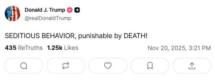 Trump hefur deilt fjölda færsla á Truth Social, hans eigin samfélagsmiðli, þar sem þingmennirnir eru kallaðir hryðjuverkamenn, föðurlandssvikarar og kallað er eftir því að þeir verði ákærðir fyrir landráð, svo eitthvað sé nefnt. Ein færslan sem Trump deildi er frá síðu með járnkross í aðalmynd en viðkomandi kallar eftir því að þingmennirnir verði hengdir og segir að George Washington hefði gert slíkt. Í eigin færslum hefur Trump einnig sagt að réttast væri að ákæra þingmennina fyrir landráð. Þeir séu svikarar og að ummæli þeirra séu stórhættuleg. „Orð þeirra geta ekki staðið. Við munum ekki eiga ríki áfram!!! Það verður að SETJA FORDÆMI,“ skrifaði Trump í einni færslu. Í annarri skrifaði hann að hegðun þingmannanna væri slæm og hættuleg. Þeir væru svikarar og landsráðsmenn og ættu að vera fangelsaðir. Síðan bætti hann við þriðju færslunni: „LANDRÁÐ, refsivert með DAUÐAREFSINGU!“ Birtu myndband eftir árásir Sex þingmenn Demókrataflokksins, sem voru á árum áður í hernum eða störfuðu fyrir leyniþjónustur Bandaríkjanna, birtu á þriðjudaginn myndband á X. Þar báðu þau hermenn og starfsmenn leyniþjónusta um að fylgja ekki ótilgreindum skipunum frá ríkisstjórn Trumps, ef þær skipanir væru ólöglegar. Umræddir þingmenn eru Elissa Slotkin, Mark Kelly, Jason Crow, Maggie Goodlander, Chris Deluzio og Chrissy Houlahan. Þau sögðu aðila innan Bandaríkjanna ógna stjórnarskrá ríkisins og sögðu að þau myndu standa við bak hermanna sem neituðu ólöglegum skipunum. We want to speak directly to members of the Military and the Intelligence Community.The American people need you to stand up for our laws and our Constitution.Don’t give up the ship. pic.twitter.com/N8lW0EpQ7r— Sen. Elissa Slotkin (@SenatorSlotkin) November 18, 2025 Samkvæmt lögum Bandaríkjanna er hermönnum skylt að neita að fylgja ólöglegum skipunum. Það að reyna að verjast lögsókn seinna meir með því að segjast eingöngu hafa verið að fylgja skipunum að ofar fríar engan ábyrgð. Meðal þess sem þingmennirnir vísa til í myndbandinu er að ríkisstjórn Trumps hafi beitt hernum gegn bandarískum ríkisborgurum, sem er í flestum tilfellum gegn lögum. Myndbandið var einnig birt í kjölfar þess að bandarískir herinn hefur grandað bátum á Kyrra- og Karíbahafi, sem sagðir eru hafa verið notaðir til að flytja fíkniefni til Bandaríkjanna og Evrópu. Að minnsta kosti áttatíu manns hafa fallið í tuttugu slíkum árásum á undanförnum vikum. Deilt er um það hvort þessar árásir séu yfir höfuð löglegar en ríkisstjórn Trumps hefur ekki lagt fram neinar haldbærar sannanir fyrir því að bátarnir hafi verið notaðir til að smygla og enginn dómstóll hefur fjallað um það hvort mennirnir um borð hafi verið sekir um einhvert lögbrot. Þá er ekki dauðarefsing við því að smygla fíkniefnum til Bandaríkjanna. Árásirnar hafa því verið kallaðar aftökur utan dóms og laga. Kvarta yfir orðræðu Demókrata Eftir að áhrifavaldurinn Charlie Kirk var myrtur kvörtuðu Repúblikanar ítrekað yfir því að orðræða Demókrata og bandamanna þeirra hefði leitt til morðsins. Það að kalla Trump, stuðningsmenn hans og aðra orðum eins fasista hefði leitt til ofbeldis í garð íhaldsmanna. JD Vance, varaforseti Bandaríkjanna, sagði til að mynda á ráðstefnu í dag að öfgasinnuð vinstri hreyfing, sem hann sagði óvini þeirra sem voru á ráðstefnunni hefði myrt vin sinn. .@VP: "Don't let the debates that we're having internally blind us to the fact that we're up against a radical leftist movement that murdered my friend... have our debates, but focus on the enemy so we can win victories that matter for the American people." pic.twitter.com/Xk2ViR5wXC— Rapid Response 47 (@RapidResponse47) November 20, 2025 Trump hefur um árabil talað um pólitíska andstæðinga sína og aðra sem honum hefur verið illa við með þeim hætti eins og hann gerir í færslunum sem nefndar eru hér að ofan.