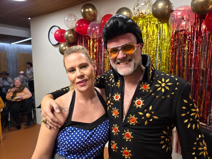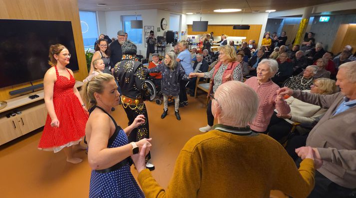 „Elvis Presley“ skemmti á hjúkrunarheimili á Selfossi Magnús Hlynur Hreiðarsson skrifar 22. nóvember 2025 20:05 Elvis Iceland fór á kostum á Móbergi á Selfossi enda mikil ánægja með heimsókn hans á heimilið. Magnús Hlynur Hreiðarsson Íbúar og starfsfólk hjúkrunarheimilisins Móbergs á Selfossi dönsuðu og dilluðu sér, sem aldrei fyrr á Elvis Presley tónleikum í gær þegar leikari í gervi Presleys mætti með hans allra vinsælustu lög Móberg er nýlegt hringlaga hjúkrunarheimili á tveimur hæðum á Selfossi og er rétt við sjúkrahúsið. 60 heimilismenn búa á Móbergi og starfsmenn eru 95. Það var blásið í herlúðra þar í gær þegar söngvari og skemmtikraftur mætti í gervi Elvis Presley og tók nokkur af hans þekktustu lögum. Léttar veitingar voru í boði. „Og ég náttúrulega kem með músíkina, sem þau elska. Maðurinn var Elvis Presley fæddur 1935. Þetta er það skemmtilegasta, sem ég geri, alveg dásamlegt að syngja og gleðja fólk,“ segir eftirherman, sem kallar sig Elvis Iceland. Var Elvis góður maður? „Alveg rosalega, ætli hann hafi ekki verið bestur við alla í kringum sig en vestur við sjálfan sig, við skulum orða það þannig“. Fjörð var svo mikið á Móbergi að starfsfólkið og nokkrir heimilismenn fóru á dansgólfið og dönsuðu við Elvis Presley. „Já og allir hér dansa endalaust við Elvis og hlusta á Elvis alla daga þannig að þetta er alveg frábært,“ segir Ásta Tryggvadóttir, deildarstjóri á Móbergi. Þetta er flott framtak og til fyrirmyndar hjá ykkur. „Alveg, við erum rosalega stolt af starfsmönnunum og hinum stjórunum frá Fossheimum og Ljósheimum, þannig að við gerum þetta i sameiningu og reynum að gera þetta saman,“ bætir Ásta við. Ásta Tryggvadóttir, deildarstjóri á Móbergi og Elvis Iceland eins og hann kallar sig.Magnús Hlynur Hreiðarsson Og heimilisfólkið á Móbergi var mjög ánægt með skemmtunina með Presley. „Hann er fínn Presley, hann stóð sig vel hvort sem hann heitir Elvis eða Presley,“ segir Guðlaugur Rúnar Guðmundsson. Var alltaf gaman af Elvis í gamla daga? „Já, alltaf gaman“. Og þú fórst út á dansgólfið og dansaðir? „Já, já, maður verður að gera það, þetta var bara fínt og skemmtilegt,“ segir Helga Jónsdóttir. Starfsfólk og heimilisfólk fór á dansgólfið með Presley.Magnús Hlynur Hreiðarsson Árborg Hjúkrunarheimili Mest lesið Kvígurnar kvaddar eftir meinta kúvendingu Landsvirkjunar Innlent Björk og Rosalía í hart við íslenska ríkið Innlent Brutu dyrakarm til að bjarga heimilismanni Innlent Íbúar grátandi og í miklu uppnámi yfir flutningi Kaffistofunnar Innlent Staðsetning flugeldanna endurskoðuð vegna drengsins Innlent Ungur drengur fékk púður úr flugeldi í augað Innlent Þrír læknar hafa sagt upp á Akureyri vegna álags Innlent Ósætti um frysta sjóði Rússa: „Witkoff þarf á geðlækni að halda“ Erlent Skilji ekki þörfina á grenndarkynningu Innlent „Fasistinn“ og „kommúnistinn“ grófu stríðsöxina Erlent Fleiri fréttir „Elvis Presley“ skemmti á hjúkrunarheimili á Selfossi Þótti grunsamlegur og reyndist vera með mikið þýfi á sér Nokkur börn lögð inn vegna flensu og gervigreindarbylting fyrir blinda Skilji ekki þörfina á grenndarkynningu Læknar veigri sér við álaginu við að vinna úti á landi Nágranni brást hratt við og stöðvaði útbreiðslu eldsins Brutu dyrakarm til að bjarga heimilismanni Nýjungar og mörg tækifæri í ferðaþjónustu í Ölfusi „Helvítis kerling“ sé eitt en hótun um íkveikju annað Staðsetning flugeldanna endurskoðuð vegna drengsins Björk og Rosalía í hart við íslenska ríkið Þrír læknar hafa sagt upp á Akureyri vegna álags Læknaskortur á Akureyri og Björk og Rosalía í hart við ríkið Endaði á ljósastaur eftir flótta undan lögreglu Kvígurnar kvaddar eftir meinta kúvendingu Landsvirkjunar Ungt fólk glími við offitu eftir einangrun í kjölfar Covid Ungur drengur fékk púður úr flugeldi í augað Íbúar grátandi og í miklu uppnámi yfir flutningi Kaffistofunnar Viðreisn hafi tekið upp málflutning Miðflokksins Hernaðarstuðningur hækkar ekki og Rutte kunnugt um „íslenska öryggismódelið“ 80% nemenda á Laugarvatni eru í kór menntaskólans Ráðherra hvatti börn til þess að mótmæla bókstafakerfi Flestir vilja að störf sérstaks saksóknara verði rannsökuð Meira í varnarmál og heitar umræður í beinni Erlendum vasaþjófum vísað úr landi Stöðvuðu stækkun Sigöldustöðvar Kanna fýsileika landeldis á Bakka Hyggjast reisa fjörutíu íbúðir í raðhúsum í Breiðholti Vara við netsvikum í nafni Skattsins Tæp tvö ár fyrir smygl á tæpum tveimur kílóum af kókaíni Sjá meira