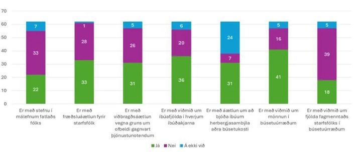 Í nýrri úttekt Gæða- og eftirlitsstofnunar velferðamála (GEV) um málefni fatlaðs fólks í sveitarfélögum kemur fram að af 62 sveitarfélögum á landinu eru aðeins 22 þeirra með sérstaka stefnu í málaflokknum. Innan við þriðjungur er með viðmið um fjölda fagmenntaðra í búsetuúrræðum fatlaðra og aðeins helmingur er með viðbragðsáætlun komi upp grunur um ofbeldi gagnvart fötluðum. Um og yfir helmingur sveitarfélaga á landinu fær falleinkunn í málefnum fatlaðs fólks samkvæmt nýrri úttekt Gæða-og eftirlitsstofnunar velferðarmála. (Úr skýrslu GEV)Vísir Gæða- og eftirlitsstofnun brýnir sveitarfélög til að setja sér fræðslu- og viðbragðsáætlanir. Starfsfólk þurfi að vera meðvitað um lögbundnar skyldur og kröfur til gæða í starfi með fötluðu fólki. Í úttektinni kemur fram að mörg sveitarfélög þurfi samkvæmt lögum um þjónustu við fatlað fólk, reglugerð um húsnæði fyrir fatlað fólk og samkvæmt nýstaðfestum Samningi sameinuðu þjóðanna um réttindi fatlaðaðs fólks, að gera miklar úrbætur. Fullkomnlega óásættanlegt Guðmundur Ármann Pétursson formaður Landssamtakanna Þroskahjálpar segir brýnt að bregðast við þessum niðurstöðum. „Ég vildi óska þess að þetta kæmi okkur á óvart en þetta eru atriði sem við höfum bent á árum saman en lítið hefur gengið. Þetta er fullkomnlega óásættanlegt,“ segir Guðmundur. Þetta þýði að stór hluti sveitarfélaga hafi þar með brugðist hlutverki sínu samkvæmt lögum. „Sveitarfélögunum var falið fyrir 15 árum að veita fötluðu fólki þjónustu og þau tóku það að sér en síðan þá hefur málaflokkurinn fyrst og fremst snúist um sveitarfélögin en ekki fatlað fólk. Stór hluti sveitarfélaga er þar með að bregðast þessum hópi og fer ekki að lögum,“ segir Guðmundur. Guðmundur furðar sig á hvað skortir víða upp á í þjónustuna. „Það er ótrúlegt að sjá, samkvæmt þessari úttekt, að aðeins innan við helmingur sveitarfélaga er með viðbragðsáætlun komi upp grunur um ofbeldi gagnvart fötluðum. Það er ekki boðlegt og t.d. á skjön við Samning Sameinuðu þjóðanna þar sem kveðið er á um að slík áætlun þurfi að vera til staðar,“ segir Guðmundur. Viðhorfin þurfi að breytast Stjórnvöld lögfestu samning Sameinuðu þjóðanna um réttindi fatlaðs fólks nú í nóvember. Guðmundur segir það afar jákvætt en viðhorf samfélagsins þurfi að breytast. „Það sem ég hef miklu meiri áhyggjur af eru viðhorf samfélagsins og sveitarfélaga gagnvart þjónustu við fatlað fólk því lögin hafa verið fyrir hendi í mörg ár og áratugi en eins og sést í þessari úttekt GEV eru alltof mörg sveitarfélög sem fara ekki eftir þeim,“ segir Guðmundur Ármann.