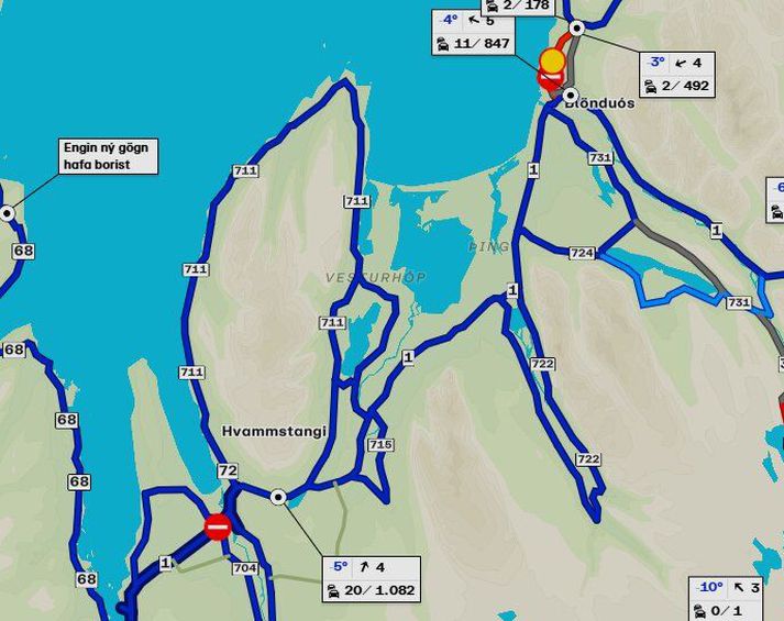 Þriggja fólksbíla árekstur nálægt Blönduósi Agnar Már Másson skrifar 23. nóvember 2025 17:47 Glerhált er og svartaþoka að sögn viðbragðsaðila en engar upplýsingar liggja fyrir um ástand farþega. Landhelgisgæslan Þyrla Landhelgisgæslunnar hefur verið ræst út eftir að árekstur varð milli þriggja fólksbíla á Þverárfjallsvegi í Austur-Húnavatnssýslu upp úr klukkan 16 í dag. Einhverjir hafa verið fluttir með sjúkrabíl undir læknishendur. Miklar umferðartafir eru á Norðurlandi vestra en annað bílslys varð á svæðinu á svipuðum tíma. Hjördís Guðmundsdóttir, samskiptastjóri almannavarna, staðfestir þetta í samtali við Vísi. Hún segir að hópslysaáætlun hafi verið virkjuð. Samhæfingastöð almannavarna hafi einnig verið virkjuð. Slys urðu á tveimur stöðum upp úr klukkan 16 í dag.Umferdin.is Fjöldi slasaðra liggur ekki fyrir. Ástand fólks sem lenti í slysinu liggur heldur ekki fyrir. Þverárfjallsvegur er lokaður vegna slyssins samkvæmt upplýsingum á umferðarvef Vegagerðarinnar. Annað slys varð kl. 16.20 við Laugarbakka í Miðfirði þar sempallbíll og jepplingur skullu saman á þjóðveginum, eins og Vísir greindi frá. Umferð Lögreglumál Slökkvilið Mest lesið „Við hjá ZoloIceland leggjum áherslu á spilavíti“ Innlent Fá bandarísku sérgreinarnar ekki viðurkenndar Innlent „Manni líður bara eins og maður sé í James Bond mynd“ Innlent Öllum í Brussel drullusama um hefndaraðgerðir Íslands Innlent Hefur látið sérsveitarmenn FBI vernda kærustu sína Erlent Andstaða eykst í Noregi gegn aðild Erlent Þingmenn segja eitt en Rubio annað: Margsaga um uppruna og tilgang friðartillagnanna Erlent Hafna kröfu Rússa um undanhald frá Dónetsk Erlent Læknar á sautján sólarhringa bakvakt Innlent Árekstur við Laugarbakka: „Glerhálka og svartaþoka“ Innlent Fleiri fréttir Þriggja fólksbíla árekstur nálægt Blönduósi Árekstur við Laugarbakka: „Glerhálka og svartaþoka“ Öllum í Brussel drullusama um hefndaraðgerðir Íslands „Við hjá ZoloIceland leggjum áherslu á spilavíti“ Óásættanlegt að ríflega helmingur sveitarfélaga falli í málefnum fatlaðra Heilbrigðisstofnun Suðurlands þarf nýja byggingu á Selfossi Fá bandarísku sérgreinarnar ekki viðurkenndar Stefnuleysi í málefnum fatlaðra og versnandi efnahagshorfur Bíll alelda við Setbergsskóla í nótt „Manni líður bara eins og maður sé í James Bond mynd“ Vextir, umhverfið og pólitíkin innan landssteina og utan Stakk af eftir harðan árekstur Læknar á sautján sólarhringa bakvakt „Elvis Presley“ skemmti á hjúkrunarheimili á Selfossi Þótti grunsamlegur og reyndist vera með mikið þýfi á sér Nokkur börn lögð inn vegna flensu og gervigreindarbylting fyrir blinda Skilji ekki þörfina á grenndarkynningu Læknar veigri sér við álaginu við að vinna úti á landi Nágranni brást hratt við og stöðvaði útbreiðslu eldsins Brutu dyrakarm til að bjarga heimilismanni Nýjungar og mörg tækifæri í ferðaþjónustu í Ölfusi „Helvítis kerling“ sé eitt en hótun um íkveikju annað Staðsetning flugeldanna endurskoðuð vegna drengsins Björk og Rosalía í hart við íslenska ríkið Þrír læknar hafa sagt upp á Akureyri vegna álags Læknaskortur á Akureyri og Björk og Rosalía í hart við ríkið Endaði á ljósastaur eftir flótta undan lögreglu Kvígurnar kvaddar eftir meinta kúvendingu Landsvirkjunar Ungt fólk glími við offitu eftir einangrun í kjölfar Covid Ungur drengur fékk púður úr flugeldi í augað Sjá meira