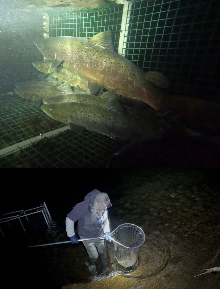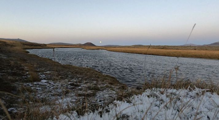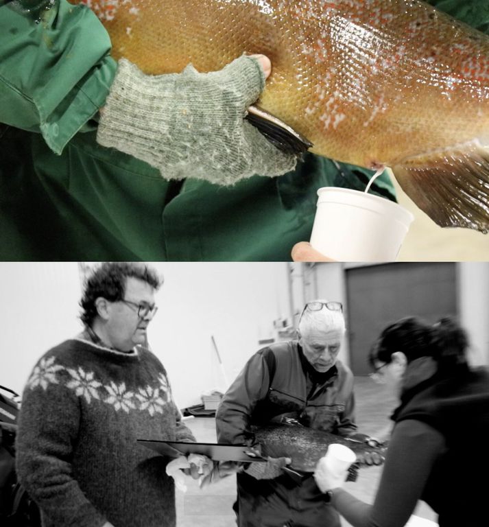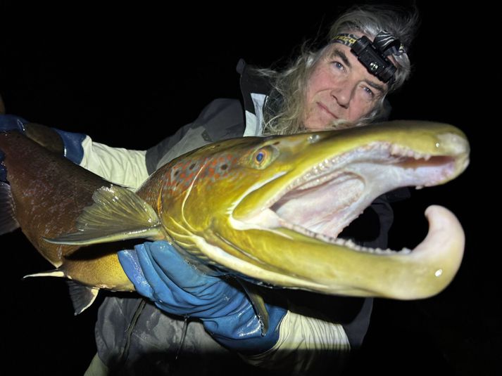 Jóhannes, sem hefur talað mjög fyrir verndun íslenska laxastofnsins, greinir frá rannsóknarveiðum sínum í færslu á Facebook. Risalaxinn var 105 cm á lengd og með ummál upp á 50 cm. Veiðiuggi á stærð við bakugga smálaxa Um var að ræða karlkyns fisk, hæng, sem kominn var í höfðinglegan hrygningarbúning með tilheyrandi krók í yfirstærð. Þá skartaði hann veiðiugga á stærð við bakugga smálaxa og hefur fengið viðurnefnið Haffjarðarárjötunninn sökum stærðar og líkamlegs atgervis. Við skoðun kom í ljós að laxinn var runninn frá hrygningu í ánni haustið 2019. Sá stóri í návígi.Kalda „Sem hrogn dvaldi hann í malarbotni Haffjarðarár um veturinn þar til hann hængur vor klaktist úr hrogninu sumarið 2020. Þá upphófst býsna sögulegt líf þessa lífseiga upprennandi laxajötuns Haffjarðarár.“ Laxinn var hraðvaxta og gekk til sjávar sem gönguseiði á þriðja sumri sínu árið 2022. Á ætisslóðum sínum í hafi dvaldi laxinn í tvö ár en gekk svo til hrygningar í Haffjarðará í fyrsta sinn sumarið 2024. Við hrygningu þegar hann náðist Vorið 2025 gekk laxinn í sjó öðru sinni á ævinni til að sækja sér æti í úthafinu. Hann dvaldi í hafi fram eftir sumri þar til hann gekk til hrygningar öðru sinni í Haffjarðará – nú í sumar þá rúmlega sex ára gamall. Þar tók laxinn þátt í hrygningu í haust og var enn við þá iðju nú í vetrarbyrjun þegar Jóhannes fékk hann í búrið. Búrið sem laxarnir synda inn í á efri myndinni. Jóhannes með háfinn á þeirri neðri.Kalda Jóhannes segir glæsilega ásýnd laxins til fagurs vitnisburðar um gott ástand laxastofnsins í Haffjarðará, sem notið hafi verndar áreiganda á umbrotatímum laxins. „Í Haffjarðará hefur eigandi árinnar Óttar Yngvason staðið fyrir margs konar aðgerðum á undanförnum árum til að verjast erfðablöndun vegna ágengni sjókvíaeldislaxa í þá þjóðþekktu fögru laxveiðiá,“ segir Jóhannes. Ein þeirra aðgerða felist í því að safna og varðveita erfðaefni laxastofns árinnar til langrar framtíðar. Fallegur dagur við Haffjarðará.Jóhannes Sturlaugsson „Þeirri fyrirbyggjandi varnaraðgerð gengur út á að geta brugðist við ágengni sjókvíaeldislaxa. Komi til þess að sjókvíaeldislaxar skaði erfðamengi laxastofns árinnar þá verður hægt í nauðvörn að notast við upprunalegt erfðaefni frá sviljafrystingu við undaneldi og tilheyrandi fiskrækt til að vinda ofan af slíkum erfðaskaða.“ Laxinn kreistur og svilin djúpfryst Svil er sæði úr karlkyns fiski. Erfðaefni er varðveitt með því að drjúpfrysta svil laxahænga með sérstakri aðferðafræði en slíkt er ekki mögulegt að gera með hrognin. Jóhannes hefur síðustu þrjú ár veitt hænga fyrir Óttar á hrygningartíma til að afla svilja til frystingar og flutt þá lifandi í flutningskerjum á rannsóknastöðina að Hesti í Borgarfirði þar sem laxinn er kreistur og svilin djúpfryst. Þegar laxahængarnir mæti á rannsóknastöðina bíði eftir þeim einvala lið sérfræðinga í frystingu laxasvilja, þau Sveinbjörn Eyjólfsson forstöðumaður, Jónas Jónasson líffræðingur og Roasana Estevez sérfræðingur. Sviljakreisting framkvæmd á rannsóknarstöðinni Hesti.Kalda „Þessi varnaraðgerð Óttars vitnar um framsýni á ögurtímum sem hann á lof skilið fyrir líkt og svo margt annað sem hann hefur lagt á sig til að verja villta íslenska laxastofna fyrir þeim skaða sem laxeldi í sjókvíum hér við land fylgir.“ Algjör gæðasvil Við hæfi sé að kalla sviljabirgðir af þessu tagi erfðaverndarsjóð og víst sé að umræddar sviljabirgðir þær sem Óttar hafi komið upp séu sannarlega erfðaverndarsjóður Haffjarðarár. „Þau svil sem þessi lífseigi Haffjarðarárjötunn átti enn í fórum sínum við fund okkar að næturlagi í Haffjarðará, reyndust sannarlega vera gæðasvil. Svil jötunsins voru djúpfryst og eru geymd framtíð Haffjarðarár til handa.“
