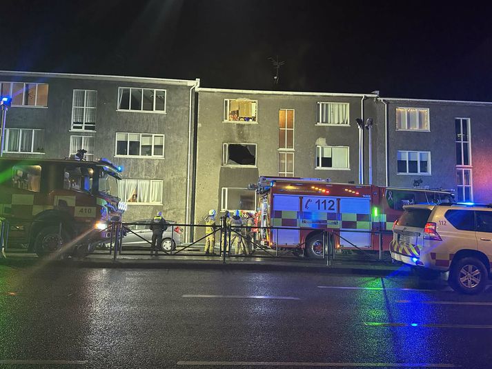 Hann segir íbúa hafa verið á svæðinu en ekki liggja fyrir hvort hann hafi verið heima þegar eldurinn kviknaði. Hann segir nokkurn eld hafa verið í íbúðinni en ekki liggja fyrir hver upptök hans voru. Eins og má sjá á myndinni er sprungin rúða og segir Steinþór hitann því líklega hafa verið töluverðan.