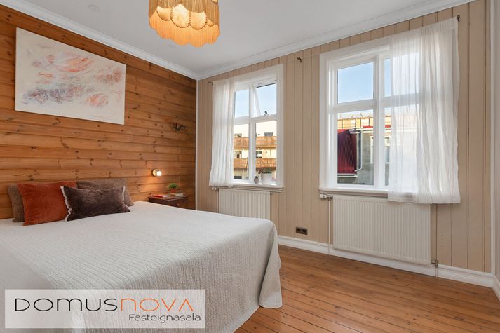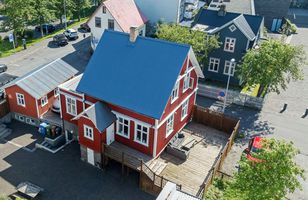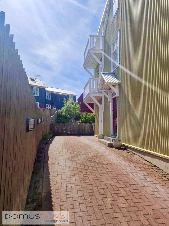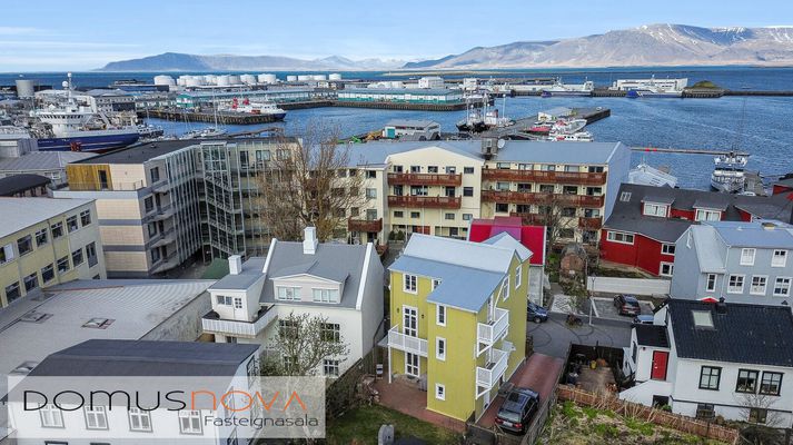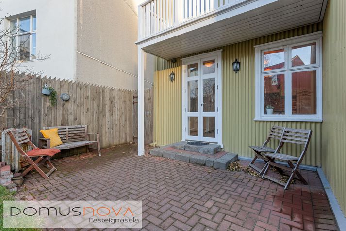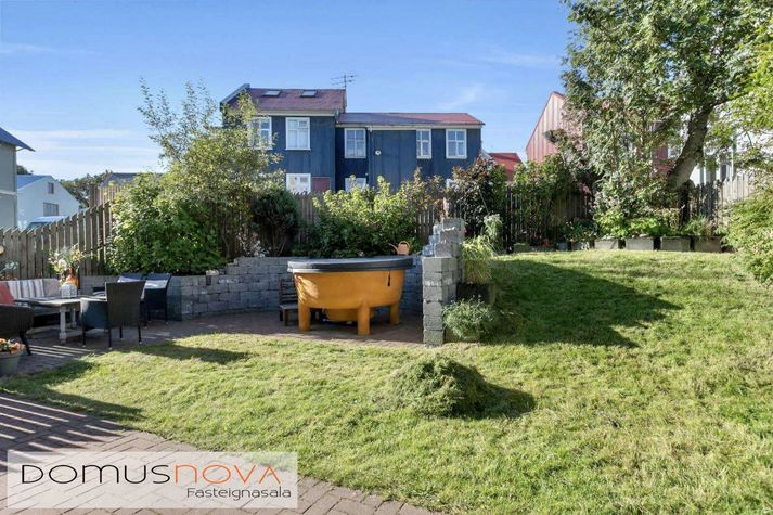 Um er að ræða rúmlega 223 fermetra einbýli sem stendur við Nýlendugötu, vistgötu inn af Norðurstíg, en ásett verð er 219 milljónir króna. Húsið var byggt árið 1898 og stóð þá við Lindargötu, var flutt að Nýlendugötu 5A árið 2005 á nýsteyptan kjallara þar og er skráð byggingarár þess því 2007. Síðan þá hafa núverandi eigendur endurnýjað húsið að fullu. Húsið er á þremur hæðum auk íbúðar í kjallara með sérinngangi. Innra skipulag samanstendur af sex svefnherbergjum, stofu, borðstofu, tveimur baðherbergjum og þvottahúsi. Skjólgóður garður með heitum potti snýr í suðvestur með gróðri, grasflöt og upphitaðri hellulögn auk skjólveggja með kvöldlýsingu. Austan við húsið er innkeyrsla sem tekur tvo bíla í stæði. Nánari upplýsingar á fasteignavef Vísis. Svona lítur húsið út að framan. Gengið út í portið. Hægt að opna út við eldamennskuna. Geggjað veggfóður á leið inn í svefnherbergi. Glerið er aðeins skyggt hér í stofunni. Sólin á svölunum. Frábært útsýni af svölunum. Eldhúsið er með sjarmerandi múrsteinum. Port með upphitaðri stétt. Sólin skín í garðinum. Skjólgóður garður með potti. Innkeyrslan er með pláss fyrir tvo bíla. Loftmynd af húsinu og hverfinu.