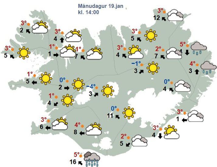 Á vef Veðurstofunnar segir að það verði rigning á norðan- og austanverðu landinu, en skúrir eða él sunnantil. Það mun létta til norðanlands eftir hádegi og austantil undir kvöld. Kólnar heldur í veðri og hiti núll til fimm stig í kvöld. „Á morgun verður austlæg átt 5-13 m/s. Skúrir eða él sunnantil, en léttskýjað að mestu fyrir norðan. Snjókoma eða slydda á austanverðu landinu eftir hádegi og einnig á Norðurlandi undir kvöld. Léttir til í öðrum landshlutum. Hiti breytist lítið. Vaxandi austanátt á miðvikudag, 10-18 m/s seinnipartinn. Skúrir, einkum suðaustantil og hiti 3 til 8 stig. Þurrt að kalla á norðan- og norðvestanlands og hiti þar nálægt frostmarki,“ segir í hugleiðingum veðurfræðings. Spákort fyrir klukkan 14 í dag.Veðurstofan Veðurhorfur á landinu næstu daga Á þriðjudag: Austan og suðaustan 5-10 m/s og él eða skúrir, hiti 0 til 5 stig. Hægari og yfirleitt þurrt á norðanverðu landinu með vægu frosti. Rigning eða slydda á Suðausturlandi og Austfjörðum seinnipartinn, en þurrt að mestu í öðrum landshlutum. Á miðvikudag: Hægt vaxandi austanátt, 8-15 seinnipartinn. Rigning eða slydda af og til sunnan- og austanlands, annars yfirleitt þurrt í veðri. Hiti 2 til 7 stig, en vægt frost norðvestantil á landinu. Á fimmtudag: Austan 10-15, en 15-20 við suðurströndina. Rigning með köflum sunnan- og austantil og á Vestfjörðum, annars þurrt. Hiti 2 til 7 stig. Á föstudag og laugardag: Austlæg átt. Lítilsháttar skúrir eða él á austanverðu landinu, en bjartviðri vestantil. Hiti kringum frostmark að deginum. Á sunnudag: Útlit fyrir austlæga átt. Bjart með köflum og sums staðar dálítil él, en léttskýjað og þurrt á vestanverðu landinu. Frost 0 til 7 stig.