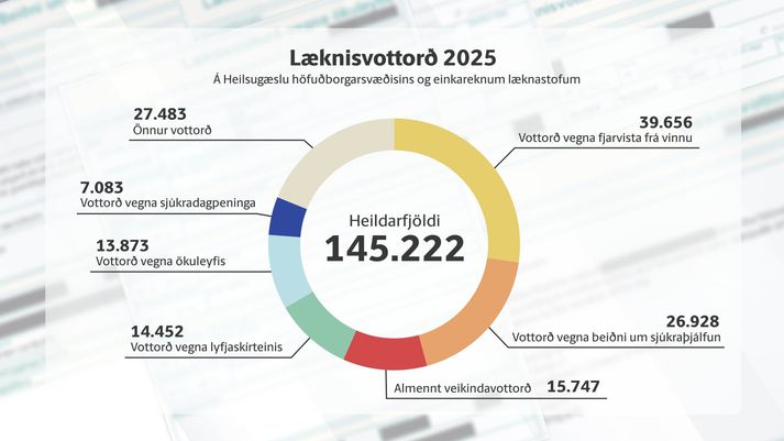 Á læknadögum í Hörpu stóð Félag íslenskra heimilislækna fyrir gjörningi til að vekja athygli á öllum þeim fjölda læknisvottorða sem gefin eru út á hverju ári. Sinnum fólki en ekki pappírum var yfirskriftin og var meðal annars hægt að nálgast vottorð um að viðkomandi þyrfti á ferð til Tenerife að halda og makavottorð til að votta að handhafi hefði rétt fyrir sér í ágreiningi heima fyrir. Samkvæmt skýrslu frá árinu 2024 gáfu heimilislæknar á höfuðborgarsvæðinu út tæplega 200.000 vottorð árið þar á undan. Hjá Heilsugæslu höfuðborgarsvæðisins og á einkareknum læknastofum voru vottorð vegna fjarveru frá vinnu langalgengust en vottorð vegna sjúkraþjálfunar og ökuleyfis einnig ofarlega á lista. Heildarfjöldi útgefinna vottorða hjá Heilsugæslu höfuðborgarsvæðisins var rúmlega 145.000 og við það bætast nokkrir tugir þúsunda sem gefin eru út á Landspítalanum.Vísir/Hjalti „Við viljum sýna fram á að því miður eru vottorðamál hjá heimilislæknum í miklum ólestri. Þetta tekur mikinn tíma frá okkur þannig að við höfum minni tíma í móttöku til að sinna okkar skjólstæðingum,“ sagði Gunnar Þór Geirsson formaður Félags íslenskra heimilislækna. „Við komumst bara ekki að borðinu“ Heilbrigðisráðherra sagði í lok síðasta árs að breyta þyrfti vottorðakerfinu sem tæki mikinn tíma frá læknum. Gunnar segir vinnuna þurfa að vera markvissari og enn séu hlutir sem þurfi að breyta. „Það er mikilvægt að heimilislæknar komi að þessari vinnu og við í FÍH höfum ekki komist að borðinu og við erum fulltrúar allra heimilislækna á landinu. Það er mikilvægt að stjórnvöld fái að vita hvað það virkilega er sem er að trufla okkur og að við getum unnið að því í sameiningu að koma þessum málum í betri farveg.“ Læknarnir útbjuggu boli með slagorði fyrir viðburðinn.Vísir Skref hafi þó verið tekin í rétta átt. „Þessi stóru vottorð sem hafa með framfærslu fólks að gera þau eru óbreytt. Einnig vottorð sem eru til lögmanna tryggingafélaga og atvinnurekenda, þetta eru vottorð sem þurfa helst að fara út að stóru leyti. Heilbrigðisyfirvöld hafa ekki verið í samvinnu við okkur. Við sem erum á gólfinu vitum hvað það er sem þarf að laga og við komumst bara ekki að borðinu,“ bætir Gunnar við. Aðrir fagaðilar jafnvel hæfari Gunnar áætlar að allt að 30% af vinnutíma heimilislækna fari í vinnu tengda útgáfu vottorða. „Þetta er óbein vinna, hringja símtöl og ganga úr skugga um að allt hafi gengið eftir. Þetta er veruleg vinna og það myndi bæta aðgengi að heimilislæknum verulega ef það yrði unnið að því með markvissum hætti að bæta þetta kerfi.“ Aðrir fagðailar sem komi að meðferð sjúklings séu hæfir til að gefa út vottorð, jafnvel hæfari ef þeir hafi komið meira að meðferð sjúklings en læknirinn. „Það geta verið til dæmis sjúkraþjálfarar, sálfræðingar og félagsráðgjafar. Ég vil sérstaklega minnast á félagsráðgjafa þar sem þeir eru sérfræðingar í þessu tryggingakerfi. Ég myndi telja að þegar um er að ræða vottorð sem hefur að gera með framfærslu fólks að það ætti að vera meira á þeirra herðum.“ Þá séu dæmi um að heimilislæknir eigi að gefa út vottorð fyrir sjúkling sem hefur verið í meðferð hjá öðrum fagaðila og heimilislæknirinn jafnvel lítið sinnt. „Síðan á hann [heimilislæknirinn] að gefa út einhverja pappíra. Það er ekki góð nýting á hans tíma.“