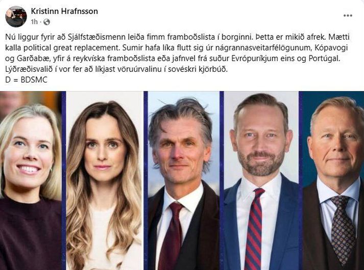 Hildur Björnsdóttir var sjálfkjörinn oddviti Sjálfstæðisflokksins í Reykjavík þar sem engin mótframboð bárust og mun því leiða flokkinn í gegnum sveitarstjórnarkosningar annað kjörtímabilið í röð. Á meðan Hildur heldur sig við Sjálfstæðisflokkinn hafa aðrir oddvitar líka fjölbreyttan bakgrunn úr starfi Sjálfstæðisflokksins í gegnum tíðina, en hafa nú róið á önnur mið og í leiðtogahlutverk hjá öðrum flokkum. Þetta á við um oddvita Framsóknarflokksins, Viðreisnar, Samfylkingarinnar og Miðflokksins í Reykjavík sem hefur líkt og áður segir vakið athygli á samfélagsmiðlum. Skjáskot/Facebook Meðal þeirra sem hafa velt þessu fyrir sér eru Kristinn Hrafnsson, fjölmiðlamaður og ritstjóri Wikileaks, Jódís Skúladóttir, fyrrverandi þingmaður VG, og bræðurnir Gunnar Smári og Sigurjón Egilssynir. Gunnar Smári birti samsetta mynd af oddvitunum fimm í spjallhópnum Rauða þræðinum á Facebook í gær, og síðan virðast fleiri hafa deilt myndinni áfram með eigin athugasemd. Gunnar bendir á að saman hefðu þessir fimm flokkar yfir áttatíu prósent fylgi samkvæmt könnun Gallup. Kristinn Hrafnson segir úrvalið jafnvel farið að líkjast „vöruúrvalinu í sovéskri kjörbúð“ og Jódís spyr „hvaða Sjálfstæðisflokk“ fólk ætli að kjósa í borginni. Skjáskot/Facebook Skjáskot/Facebook Formaður ungliðahreyfingar, aðstoðarmaður ráðherra og framboð til Alþingis En hver eru tengsl þessa fólks við Sjálfstæðisflokkinn? Einar Þorsteinsson, fyrrverandi borgarstjóri, verður áfram oddviti Framsóknarflokksins í borginni í vor, en hann tók þátt í ungliðastarfi Sjálfstæðisflokksins þegar hann var yngri. Einar var til að mynda formaður Týs, félags ungra Sjálfstæðismanna í Kópavogi. Hann átti svo nokkurra ára feril í fjölmiðlum áður en hann gekk til liðs við Framsóknarflokkinn sem hlaut sögulega kosningu í Reykjavík undir forystu Einars í síðustu borgarstjórnarkosningum. Það vakti einnig athygli þegar Pétur Marteinsson bauð sig fram í oddvitasæti Samfylkingarinnar í borginni, þar sem hann hafði betur gegn Heiðu Björgu Hilmisdóttur, sitjandi borgarstjóra. Framboðið vakti ekki síður athygli fyrir þær sakir að Pétur hefur áður verið viðloðandi Sjálfstæðisflokkinn og var til að mynda í níunda sæti á lista Sjálfstæðisflokksins í Alþingiskosningum árið 2009 í Reykjavíkurkjördæmi norður. Það vakti líka athygli þegar Pétri vafðist tunga um tönn í viðtali við Rúv þegar hann tilkynnti um framboð sitt til oddvita, þar sem hann var hálfnaður með að segja að hann væri í framboði „fyrir Sjálfst…“ en ekki Samfylkinguna, sem honum svo tókst að leiðrétta áður en hann lauk setningunni. Þá tryggði Björg Magnúsdóttir sér oddvitasæti Viðreisnar í Reykjavík á dögunum þar sem hún hlaut yfirgnæfandi kosningu. Björg hefur komið við í fleiri flokkum áður en hún tryggði sér sjálf fyrsta sætið hjá Viðreisn, en ekki er langt síðan hún starfaði sem aðstoðarmaður borgarstjóra Framsóknarflokksins, einmitt fyrrnefnds Einars Þorsteinssonar. Þá hefur Björg einnig tekið þátt í starfi Sjálfstæðisflokksins en það vakti til að mynda athygli þegar hún mætti á hverfisfund Sjálfstæðismanna í Fossvogi, á meðan hún gegndi starfi aðstoðarmanns borgarstjóra Framsóknarflokksins. Þá sagði Björg að það væri ekkert launungarmál að hún hafi tekið þátt hjá mörgum flokkum og væri skráð í marga flokka, meðal annars Sjálfstæðisflokkinn. Nú síðast tilkynnti Miðflokkurinn í gær að Ari Edwald muni leiða lista flokksins. Ari vakti sjálfur máls á því í framboðstilkynningu sinni á samfélagsmiðlum í gær að hann hafi til þessa verið Sjálfstæðismaður. „Ég hef lengi verið Sjálfstæðismaður, eins og þið vitið flest sem þekkið mig. Mér finnst mínar skoðanir og áherslur ekki hafa breyst, en mér finnst ég finna mestan samhljóm nú með Miðflokknum og treysti honum best til að koma þeim í framkvæmd,“ skrifaði Ari meðal annars en hann starfaði til að mynda í átta ár sem aðstoðarmaður Þorsteins Pálssonar á meðan hann var ráðherra Sjálfstæðisflokksins. Síðar sagði Þorsteinn skilið við Sjálfstæðisflokkinn og tók þátt í stofnun Viðreisnar á sínum tíma líkt og kunnugt er. Einhverjir eiga enn eftir að velja oddvita Þau fimm verða þó ekki einu oddvitarnir sem leiða lista í Reykjavík. Sósíalistar kynntu til leiks Silju Sóleyju Birgisdóttur, sinn oddvita í Reykjavík í dag, en Sanna Magdalena Mörtudóttir mun leiða lista Vors til Vinstri sem býður fram í bandalagi með Vinstri grænum. Hvorug þeirra hefur tekið þátt í starfi Sjálfstæðisflokksins svo fréttastofu sé kunnugt um. Þá hafa VG blásið til forvals til að velja á lista sem fer fram 20.–22. febrúar þar sem Líf Magneudóttir, núverandi oddviti VG, er meðal frambjóðenda. Prófkjör Pírata hefur verið boðað dagana 26. febrúar til 6. mars, en þegar hefur borgarfulltrúinn Alexandra Briem gefið kost á sér í fyrsta sætið, en framboðsfrestur rennur út þann 14. febrúar hjá Pírötum. Þá liggur ekki fyrir ennþá hvenær eða með hvaða hætti Flokkur fólksins hyggst velja á lista í Reykjavík, en Helga Þórðardóttir, sitjandi oddviti flokksins í Reykjavík, hyggst ekki gefa kost á sér áfram. Frestur til að skila inn framboðum til sveitarstjórnarkosninga rennur út 10. apríl næstkomandi og þá mun liggja fyrir hversu mörg framboð bjóða fram lista í höfuðborginni, og eftir atvikum hvort fram koma fleiri oddvitar sem áður hafa tekið þátt í starfi Sjálfstæðisflokksins.