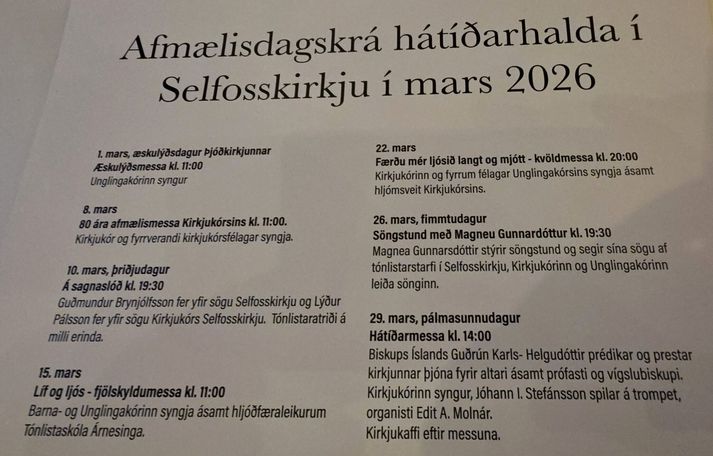 Árborg Þjóðkirkjan Mest lesið Vissu ekki að bíllinn hefði oltið fyrr en þær sáu myndir Innlent Íslendingar gerðu það sem tröllunum mistókst Innlent Bíll við bíl undir Eyjafjöllum: „Þetta er allt í kaos“ Innlent Segist ætla senda spítalaskip til Grænlands Erlent Sjálfsafgreiðslukassar og aukin sjálfvirkni auki vandann Innlent Töluverður viðbúnaður vegna tilkynningar um kajak Innlent „Held hann hafi ekki fattað hvað hann fór rétt að“ Innlent Á sjötta hundrað lentu í vandræðum Innlent Reykur sást á flugvallarsvæðinu Innlent Fjórir sinueldar á sólarhring: „Við skulum bara leggjast á bæn og vona að það komi snjór“ Innlent Fleiri fréttir Rúta full af ferðamönnum fór út af veginum Vísar gagnrýni verkalýðsleiðtoga til föðurhúsanna Býst við að samningar náist fljótlega og auglýsir eftir starfsfólki Fjórir sinueldar á sólarhring: „Við skulum bara leggjast á bæn og vona að það komi snjór“ Leitað logandi ljósi eftir nýjum kirkjugarði á Selfossi Sjálfsafgreiðslukassar og aukin sjálfvirkni auki vandann Sinueldar, sjúklingar og skafrenningur Reykur sást á flugvallarsvæðinu Töluverður viðbúnaður vegna tilkynningar um kajak Á sjötta hundrað lentu í vandræðum Framtíð Framsóknar, afbrotatölfræði og vankantar á tryggingamarkaði Íslendingar gerðu það sem tröllunum mistókst Þrír sinueldar á innan við sólarhring Kerfið er vandamálið ef það styður ekki nýsköpun Metfjöldi gesta tvo daga í röð Vissu ekki að bíllinn hefði oltið fyrr en þær sáu myndir „Held hann hafi ekki fattað hvað hann fór rétt að“ Bíll við bíl undir Eyjafjöllum: „Þetta er allt í kaos“ Heitur matur í boði á ný Deilt um opnunartímann: „Sonur minn var hundfúll út í mig“ Sinueldur barst í heyrúllur í Hvalfirði Framboðslistinn tilbúinn í Fjarðabyggð Tryggingar lækki verulega verði ráðist í nauðsynlegar úrbætur Átta konur eru í slökkviliðum í Árnessýslu Svo margir á skíðum að lögreglan skarst í leikinn Lögreglan lokaði fyrir umferð í Hlíðarfjall Fjölgaði í flokknum vikurnar fyrir forvalið Skipti um akrein í tæka tíð þegar bíll ók á móti umferð Kjósa um sameiningu Árneshrepps og Kaldrananeshrepps Gagnrýnir að ekki séu settar strangari kröfur á verktaka Sjá meira