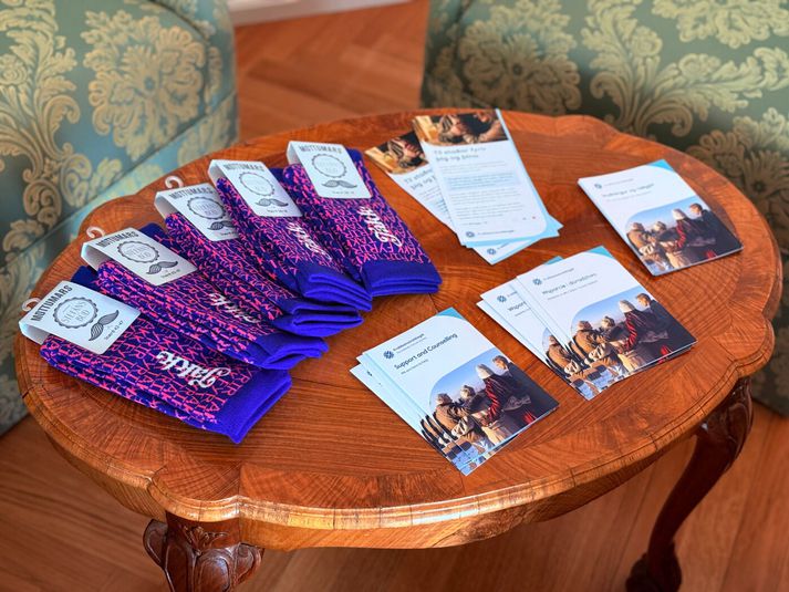 Móttökurnar á Bessastöðum voru góðar þegar Stefán Svan Aðalsteinsson, hönnuður Mottumarssokkanna í ár, afhenti forsetahjónunum fyrstu pörin. Forsetinn þakkaði félaginu fyrir að opna á umræðuna og undirstrikaði mikilvægi þess að enginn upplifi einmanaleika og einangrun í erfiðum veikindum. Mottumarssokkarnir í ár eru hannaðir af Stefáni Svan í Stefánsbúð í samstarfi við grafísku hönnuðina Lindu Loeskow og Anton Kaldal Ágústsson. Stefán var valinn úr hópi tæplega hundrað umsækjenda sem sóttu um að fá að hanna sokkanna. Hönnunin byggir á orðunum „Takk fyrir“ sem fléttast saman í áberandi mynstri og leturgerð. Í þeim felst þakklæti til samfélagsins alls, en þó sérstaklega til þeirra sem takast á við krabbamein og aðstandenda sem standa þétt við bakið á þeim. Stefán Svan hannar sokkana í ár. Stefán, Anton og Linda þekkja öll glímuna við krabbamein sem aðstandendur, auk þess sem Linda hefur sjálf reynslu af því að hafa fengið krabbamein tvisvar. Hönnunin er því ekki aðeins falleg heldur persónuleg, einlæg og sprottin úr djúpri samstöðu, sem er einmitt áhersla Mottumars í ár. Allur ágóði af sölu Mottumarssokkanna rennur til starfsemi Krabbameinsfélagsins sem miðar að því að færri fái krabbamein, fleiri læknist, lifi lengi og líði betur. Öll starfsemi félagsins byggir á stuðningi almennings og fyrirtækja og Mottumars er ein af lykilstoðum hennar. Sokkarnir í ár eru litríkir og koma í nokkrum öðrum litum en þessum bláu og fjólubláu sem sjást hér.