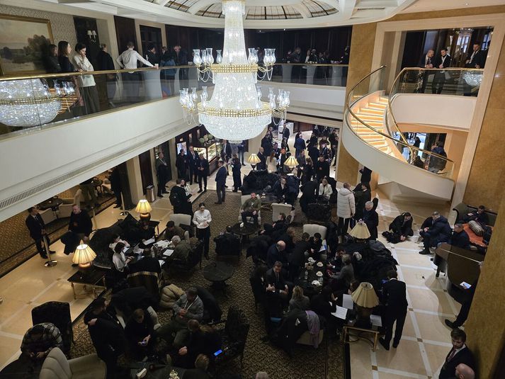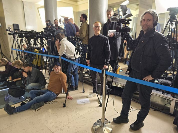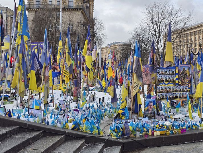 Dagur í Kænugarði en þrír sólarhringar á flakki Samúel Karl Ólason skrifar 14. mars 2026 07:00 Það gekk mikið á í Kænugarði þann 24. febrúar, þegar fjögur ár voru liðin frá því að innrás Rússa hófst. Vísir/Sammi Ég hef um árabil haft mikinn áhuga á ástandinu í Úkraínu og fylgst grannt með vendingum þaðan. Þegar mér bauðst svo loks að leggja land undir fót og heimsækja Úkraínu hefði maður haldið að mín fyrstu viðbrögð yrðu: „Ójá“ eða „Let's go!“. Svo reyndist ekki vera. „Er það?“ sagði ég í staðinn. Fullur efasemda. Það fyrsta sem ég hugsaði var hvað þetta yrði hræðilegt ferðalag. Það ætti hreinlega eftir að sökka. Ég hafði einnig áhyggjur af því hvað maður myndi græða á ferð eins og þessari, þar sem maður yrði að mestu á hlaupum milli blaðamannafunda og viðburða. Ég er þó sem betur fer ekki það heimskur og latur að segja nei, enda hefði það verið fáránlegt. Sunna Sæmundsdóttir varafréttastjóri, sem sagði mér að til boða stæði að heimsækja Kænugarð í för með sendinefnd forsætisráðherra og bauð mér að fara, hafði orð á því daginn eftir að viðbrögð mín hefðu verið ákveðin vonbrigði. Önnur samstarfskona mín hafði reyndar orð á því að þetta hefðu verið mjög „Sammaleg“ viðbrögð. Ég veit ekki alveg hvað mér finnst um það. Það verður þó að segjast, að þessar vangaveltur eða áhyggjur áttu að miklu leyti rétt á sér. Þetta var MIKIÐ ferðalag en það var alls ekki slæmt. Mikið ferðalag og fjórtán tímar á hlaupum Í rauninni stóð ferðalagið yfir í rétt rúma þrjá sólarhringa en við vörðum þó ekki nema um fjórtán tímum á hlaupum um Kænugarð. Þar hjálpaði verulega að hópurinn var skipaður góðu fólki í alla staði. Með mér fór Bjarni Einarsson, sem er tökumaður og algjört gull af manni. Þá voru einnig blaðamenn, tökumaður og ljósmyndari frá Ríkisútvarpinu og Morgunblaðinu og fleiri topp menn. Þetta er hópurinn sem ég og Bjarni ferðuðumst með til Póllands og Kænugarðs. Frá vinstri: Eyþór Árnason ljósmyndari Morgunblaðsins, ég, Sölvi Andrason tökumaður hjá RÚV, Sighvatur Arnmundsson upplýsinafulltrúi forsætisráðuneytisins, Björn Malmquist fréttamaður RÚV, Karl Blöndal aðstoðarritstjóri Morgunblaðisins og Bjarni Einarsson, tökumaður hjá Sýn. Við byrjuðum á því að hittast á flugvellinum í Keflavík um miðnætti á sunnudagskvöldi en þaðan áttum við bókað flug með WizzAir til Varsjár. Þar mættum við í sendiráð Íslands í Varsjá, þar sem tekið var á móti okkur með þessari dýrðarinnar heimabökuðu köku. Eftir smá bið í sendiráðinu hoppuðum við upp í þessa fínustu partírútu og í tæplega fjögurra klukkustunda rúnt til bæjarins Przemyśl, (sem mér er algerlega ómögulegt að læra að bera rétt fram) sem er nærri landamærum Póllands og Úkraínu. Þar þurftum við reyndar að bíða í þó nokkra klukkutíma eftir lestinni til Úkraínu og var tímanum varið í allskonar spjall og göngutúra um bæinn, þar sem menn voru mismikið týndir. Hugrekkishraðlestin Úkraínumenn kalla lestina til Kænugarðs „Hugrekkishraðlestina“.Vísir/Sammi Lestin kom þó á endanum og tóku tvær yndislegar konur, sem töluðu ekki stakt orð á ensku, á móti íslenska hópnum og komum við okkur fyrir í tveimur lestarvögnum í „Hugrekkishraðlestin,“ eins og Úkraínumenn kalla hana. Enginn flýgur til Úkraínu þessa dagana, af skiljanlegum ástæðum, og er lest þessi mjög vinsæll ferðamáti fyrir þá sem þurfa að fara til Kænugarðs, og sá eini fyrir utan það að keyra. Þessa tilteknu nótt fóru að minnsta kosti átta þjóðarleiðtogar og háttsettir embættismenn frá Evrópusambandinu frá Póllandi til Úkraínu í þremur mismunandi lestum Áður en við fórum um borð í lestina þurftum við þó að gangast sprengjuleit. Það leiðinlega við þetta ferðalag var að það var farið að nóttu til. Á rúntinum til landamæranna hafði maður gott tækifæri til að virða umhverfið fyrir sér, eins og það að skoða herstöð nærri landamærunum þar sem við sáum fyrstu ummerkin um stríðsástandið í Úkraínu, vörubíla sem notaðir voru til að flytja hergögn til Úkraínu og Patriot-loftvarnarkerfi nærri landamærunum. Brynvarðir bílar á leið til Úkraínu.Vísir/Sammi Það gafst lítið tækifæri til þess að horfa í kringum sig í Úkraínu, hvorki í lestarferðunum tveimur eða í Kænugarði. Í lestinni var alltaf myrkur fyrir utan og í Kænugarði var dagskráin frekar stíf. Þegar við fórum um borð í lestina í fyrsta sinn var nærri því sólarhringur liðinn af ferðalagi okkar og við stóðum frammi fyrir um níu klukkutíma lestarferð. Hún varð reyndar aðeins styttri þar sem nokkrar tafir höfðu orðið á ferðalaginu og virðist sem að stjórnendur lestarinnar hafi gefið í til að vinna upp tapaðan tíma. Ég hafði lítið sofið þegar í lestina var komið. Maður hafði náð litlum lúrum í bílnum en það er óhætt að segja að maður hafi hvílst tiltölulega lítið. Í lestinni gekk ekkert allt of vel að sofa en það hafðist þó í einhverja klukkutíma. Gífurleg öryggisgæsla Þegar ég og Bjarni vöknuðum eldsnemma á þriðjudeginum var stutt í komuna til Kænugarðs. Dagurinn hófst því á miklum hraða og hélt hraðinn sér nánast samfleytt út allan daginn. Utanríkisráðherra Úkraínu tók á móti okkur á lestarpallinum. Mig grunar reyndar að hann hafi aðallega verið þarna til að hitta Kristrúnu Frostadóttur, forsætisráðherra, og var stutt móttökuathöfn haldin á staðnum. Strax í kjölfarið var okkur smalað upp í bílalest og við flutt gegnum Kænugarð. Fyrir utan hergögnin í Póllandi fékk maður þarna fyrst að sjá