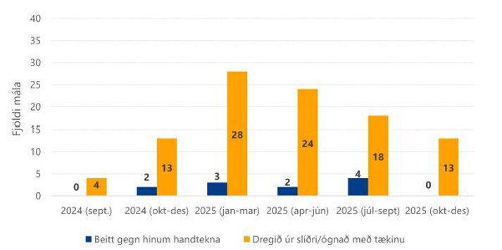 Þetta segir í skýrslu Ríkislögreglustjóra um notkun svokallaðra rafvarnarvopna við handtöku. Þar segir að rafvarnarvopn hafi verið tekin í notkun sem valdbeitingartæki hjá lögreglu í september 2024. Rafvarnarvopnin séu á sama stigi í valdbeitingarstiganum og kylfa og varnarúði og gefi lögreglu aukna möguleika á að velja þann varnarbúnað sem hæfir hverju verkefni. Með því sé leitast við að auka öryggi almennings og lögreglu. Þegar allt árið 2025 sé skoðað eftir ársfjórðungum megi sjá að flest mál þar sem vopn er dregið úr slíðri eða ógnað með tækinu hafi verið á fyrsta ársfjórðungi, eða í 28 málum. Tækinu hafi oftast verið beitt á þriðja ársfjórðungi, eða í fjórum málum. Á síðasta ársfjórðungi ársins hafi fæst mál verið hvort sem litið er til fjölda þar sem tæki var dregið úr slíðri/ógnað eða beitt. Fjöldi mála þar sem rafvarnarvopni var beitt eða dregið úr slíðri/ógnað frá sept 2024 til og með desember 2025.Ríkislögreglustjóri