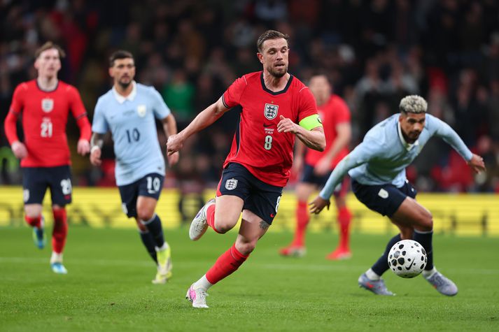Ben White hafði ekki komið við sögu fyrir enska landsliðið síðan hann lenti í útistöðum við aðstoðarþjálfara Englands á HM 2022. White yfirgaf mótið í Katar og gaf ekki kost á sér aftur fyrr en Tomas Tuchel tók við þjálfarastöðunni í fyrra. Hann kom inn af varamannabekknum í æfingaleik gegn Úrúgvæ í gær og skoraði þar sitt fyrsta landsliðsmark, en braut síðan á Federico Valverde og gaf frá sér vítaspyrnu. Úrúgvæ skoraði úr vítinu og leiknum lauk því með 1-1 jafntefli. Bæði þegar hann kom inn á og einnig eftir leik fékk White að heyra hressilegt baul frá stuðningsmönnum. Liðsfélagar hans hafa nú komið White til varnar. „Við stöndum saman í þessu og styðjum hvorn annan. Ég hef lent í þessu sjálfur en þetta er líka bara hluti af því að spila fyrir enska landsliðið. Sumir áhorfendur vita ekki einu sinni hvers vegna þeir eru að baula, þeir hlusta á eitthvað sem er sagt í fjölmiðlum og oft er það ekki satt,“ sagði Henderson. Jordan Henderson var fyrirliði Englands í leiknum gegn Úrúgvæ. Marc Atkins/Getty Images „Fáir vita hvað gekk raunverulega á þegar við vorum í Katar og við leysum svona mál innanbúða. Ben hefur verið frábær síðan hann sneri aftur og við stöndum með honum,“ sagði Henderson.