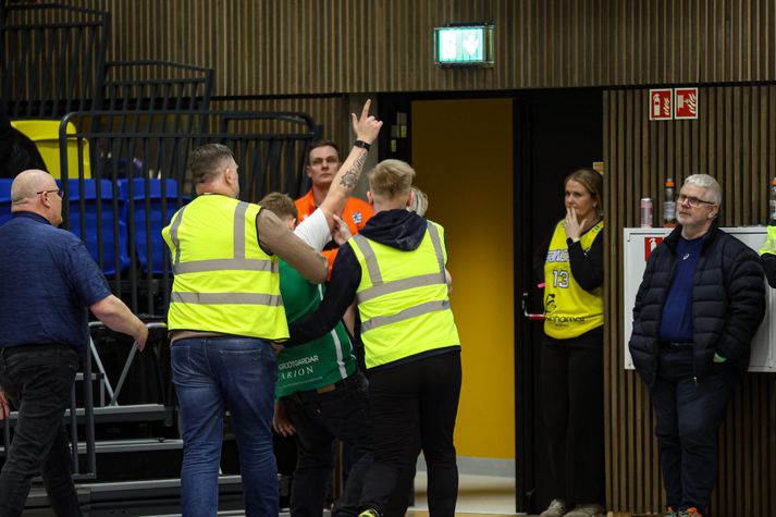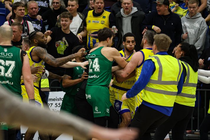 Sjáðu slagsmálin í Grindavík: Stuðningsmenn stukku út á gólf og lögreglan skarst í leikinn Ágúst Orri Arnarson skrifar 1. apríl 2026 21:44 Dominykas Milka var rekinn úr húsi fyrir sinn þátt í slagsmálunum. vísir / guðmundur Allt sauð upp úr undir lok leiks Grindavíkur og Njarðvíkur í fyrstu umferð úrslitakeppni Bónus deildar karla. Slagsmál brutust út og lögreglan þurfti að skerast í leikinn. Atvikið má sjá hér fyrir neðan. Klippa: Slagsmál í leik Grindavíkur og Njarðvíkur Njarðvík var búið að snúa leiknum við og taka forystuna þegar til kastanna kom á milli Dwayne Lautier og DeAndre Kane. Kristófer Breki Gylfason, leikmaður Grindavíkur, var snöggur að svara fyrir olnbogaskotið sem Kane fékk frá Lautier. Fleiri leikmenn blönduðu sér svo í málið. Ekki nóg með leikmenn liðanna hjóluðu í hvorn annan heldur voru stuðningsmenn líka mættir út á gólf. Öryggisgæslan réði ekki við allan fjöldann og lögreglan stökk af stað til að skerast í leikinn. Stuðningsmaður Njarðvíkur sá ekki síðustu mínútur leiksins. vísir / guðmundur Á endanum tókst að róa mannskapinn niður en þá þurftu dómararnir að telja saman allar villurnar og komast að einhverri skynsamlegri niðurstöðu. Sem reyndist tímafrekt. Jordan Semple var í miðjum átökunum.vísir / guðmundur Dominykas Milka var rekinn út úr húsi fyrir sinn þátt í slagsmálunum, nokkrir leikmenn fengu óíþróttamannslegar villur og þjálfarar beggja liða fengu tæknivillur. En sá sem lét mest fyrir sér fara í þessu slagsmálum, Jordan Semple, slapp við refsingu. Eftir öll þessi læti stóð Njarðvík uppi sem sigurvegari í fyrsta leik einvígisins. Lesa má um leikinn í uppgjörinu hér fyrir neðan. Bónus-deild karla UMF Njarðvík UMF Grindavík Mest lesið Stjórn Keflavíkur sendir frá sér yfirlýsingu Körfubolti Þjálfarinn á Tene degi fyrir leik í úrslitakeppni: „Ég væri brjáluð“ Körfubolti Uppgjörið:Grindavík - Njarðvík 87-97| Njarðvíkingar taka fyrsta leik með látum Körfubolti Sjáðu slagsmálin í Grindavík: Stuðningsmenn stukku út á gólf og lögreglan skarst í leikinn Körfubolti Danir að þvælast fyrir viðræðum HSÍ við Snorra og Arnór? „Styttist í fréttir“ Handbolti Uppgjörið Stjarnan - KR 97-86 | Stjarnan tók öll völd í seinni hálfleik Körfubolti Segja hann koma úr efstu deild í Litháen en hann féll úr B-deildinni Íslenski boltinn Tiger rýfur þögnina og ætlar að leita sér hjálpar Sport Nýr stjóri Tottenham ekki velkominn hjá stuðningsmönnunum Enski boltinn Kom að luktum dyrum hjá Óskari: „Hef ekki tíma í þetta“ Íslenski boltinn Fleiri fréttir Uppgjörið:Grindavík - Njarðvík 87-97| Njarðvíkingar taka fyrsta leik með látum Sjáðu slagsmálin í Grindavík: Stuðningsmenn stukku út á gólf og lögreglan skarst í leikinn Uppgjörið Stjarnan - KR 97-86 | Stjarnan tók öll völd í seinni hálfleik Hamar/Þór að ganga frá nágrönnunum Martin með bakið upp við vegg Fjölniskonur stíga stór skref í átt að úrvalsdeild Tryggvi og félagar í fínni stöðu fyrir seinni leikinn „Þetta bara öskrar á fimm leiki“ Stjórn Keflavíkur sendir frá sér yfirlýsingu Berglind sú yngsta til að skora tuttugu stig í úrslitakeppni „Þá er hann langhættulegasti leikmaður þessarar deildar“ Leitar til Harry Potter gegn galdraskák Grindvíkinga Þjálfarinn á Tene degi fyrir leik í úrslitakeppni: „Ég væri brjáluð“ „Dómarinn þarf að vera 100% viss um að þetta sé viljandi“ Uppgjörið KR - Keflavík 85-69 | KR-ingar voru feti framar allan leikinn og innbyrtu sigur Uppgjörið: Valur - Grindavík 55-59 | Hrifsuðu heimavöllinn til sín Byrjaði á bekknum eftir að náttúran kallaði Uppgjörið: Njarðvík - Tindastóll 103-97 | Njarðvík tók forystuna í einvígi sínu við Tindastól Uppgjörið: Haukar - Stjarnan 106-100 | Endurkoma Stjörnunnar dugði ekki til Jóhanna stígur til hliðar eftir fimmtán ár sem formaður Ævintýraleg sigurkarfa Indiana-stráksins í Marsfárinu Skoraði 103 stig í körfuboltaleik „Hann er kominn aftur“ Missa af úrslitakeppninni í fyrsta sinn í tíu ár Gaf stoðsendingu á son sinn og setti enn eitt metið Tryggvi góður en Bilbao fór tómhent heim Tómas Valur skiptir um skóla í Bandaríkjunum Danielle og Þórir bestu leikmenn ársins Svona var lokahóf KKÍ Lárus hefur áhuga á að þjálfa Þór Þorlákshöfn áfram Sjá meira