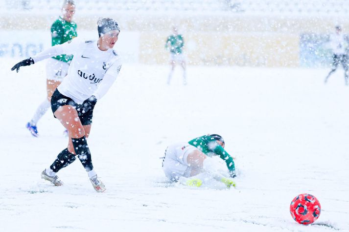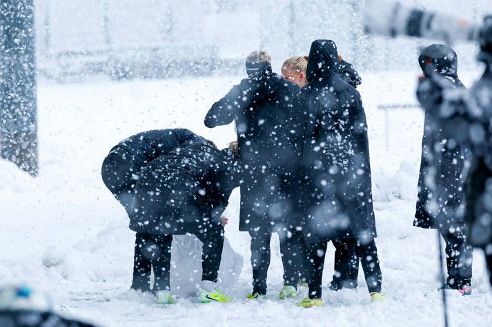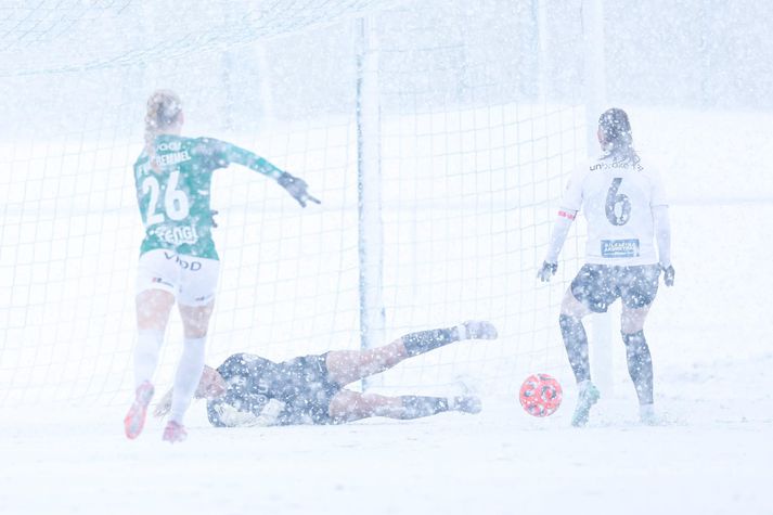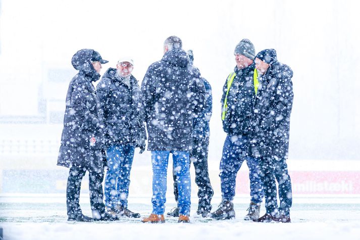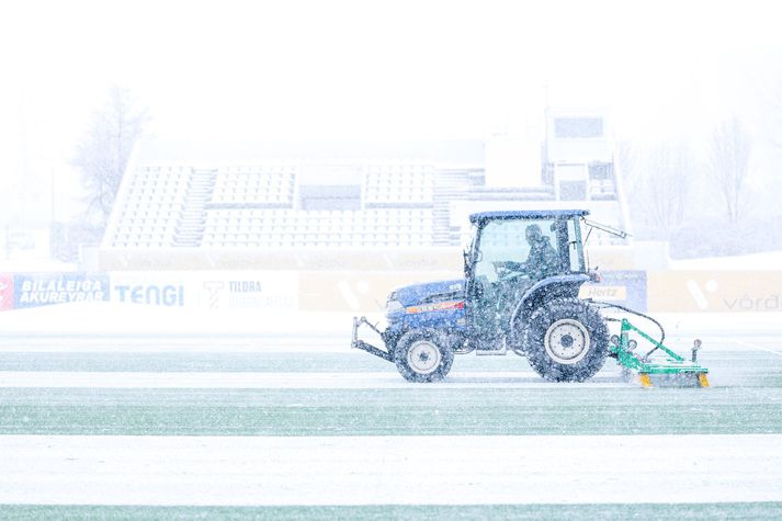 Meistarakeppni kvenna í fótbolta aflýst vegna veðurs Sesselja Ósk Gunnarsdóttir skrifar 2. apríl 2026 15:14 Það var allt reynt til þess að gera hliðarlínurnar sýnilegar. Hulda Margrét Leik Breiðabliks og FH í Meistarakeppni kvenna í fótbolta var aflýst í dag vegna veðurs. Leiknum var fyrst um sinn frestað um korter vegna mikillar snjókomu en eftir að liðin höfðu spilað í átta mínútur var leikurinn stöðvaður. Meistarakeppnin er árlegur viðburður þar sem ríkjandi Íslands- og bikarmeistarar mæta í leik til þess að útkljá hverjir séu meistarar meistaranna. Breiðablik er hins vegar bæði ríkjandi Íslands- og bikarmeistarar. Árangur FH á síðasta tímabili veitti liðinu þátttökurétt í Meistarakeppninni þetta árið. Leikurinn í dag var til styrktar Kolfinnu Rán Færseth. Kolfinna er fótboltastelpa fædd árið 2013 en hún berst við krabbamein. Allur ágóði af leiknum rennur óskiptur til Kolfinnu. Reikningur Kolfinnu: 0702-15-190113 Kt.190113-2210 #FyrirKolfinnu Hulda Margrét Leiknum var fyrst um sinn frestað um 15 mínútur og á meðan voru tveir traktorar að skafa völlinn. Það bar hins vegar lítinn árangur. Stöðufundurinn kl 14:00 þegar leikurinn átti að hefjast en þá var tekin ákvörðun um að fresta upphafsflautinu um korter.Hulda Margrét Traktorarnir reyndu sitt besta í dag.Hulda Margrét Línur á vellinum voru hvergi sjáanlegar og voru menn út um allan völl að reyna skafa markmannsteiginn og hliðarlínurnar á meðan leik stóð. Það voru allir að reyna sitt allra besta.Hulda Margrét Vægast sagt slæmar aðstæður til þess að spila fótbolta í.Hulda Margrét Steinunn Erna, markvörður FH, varði frábærlega í þrígang á fyrstu mínútum leiksins.Hulda Margrét Eftir um átta mínútur var leikurinn stöðvaður þar sem fyrirliðar liðanna ræddu saman við dómara leiksins og ákvörðun var tekin um að fresta leiknum um korter í viðbót og taka svo stöðuna. Þjálfarar liðanna ræða sín á milli.Hulda Margrét Áfram hélt að kyngja niður snjó og snjómokstur bar engan árangur. Niðurstaðan því sú að leikurinn verði spilaður sólarhring síðar eða á morgun föstudaginn langa kl 14:00 á Kópavogsvelli. Varamannabekkur FH stytti sér stundir á meðan stöðufundur fór fram.Hulda Margrét Eini afrakstur dagsins ef svo má segja.Hulda Margrét Fótbolti FH Breiðablik Mest lesið Fimm kærur á borði aganefndar: „Lítum þetta alvarlegum augum“ Körfubolti Sjáðu slagsmálin í Grindavík: Stuðningsmenn stukku út á gólf og lögreglan skarst í leikinn Körfubolti Grindvíkingar harma og fordæma hegðunina Körfubolti Fékk leyfi til að fara í meðferð utan Bandaríkjanna Golf Breiðablik - FH | Bikar í boði í meistarakeppninni Íslenski boltinn Meistarakeppni kvenna í fótbolta aflýst vegna veðurs Íslenski boltinn Flautað af í Árbæ vegna snjókomu Íslenski boltinn „Skemmir bara fyrir báðum liðum og bara leiðinleg uppákoma“ Sport Húðflúrum þjálfarans fjölgar eftir sögulegan sigur Íslendings á NM Sport Besta-spáin 2026: Mæta með læti Íslenski boltinn Fleiri fréttir Meistarakeppni kvenna í fótbolta aflýst vegna veðurs Flautað af í Árbæ vegna snjókomu Breiðablik - FH | Bikar í boði í meistarakeppninni „Ég er spenntur fyrir Þórsurum“ Besta-spáin 2026: Mæta með læti Kane ver mark Blika Í toppstandi og stefnir á alla titla Kom að luktum dyrum hjá Óskari: „Hef ekki tíma í þetta“ „Á mjög erfitt með að sjá þetta vera jafn gott og síðasta sumar“ Segja hann koma úr efstu deild í Litháen en hann féll úr B-deildinni Besta-spáin 2026: Ætla blása hrakspárnar aftur á haf út Sérfræðingarnir svara: Hver hefur mest að sanna í sumar? Hollenskur varnarmaður gengur í raðir Vals „Vil sjá Keflvíkinga koma sér á þann stað sem þeir voru á“ Besta-spáin 2026: Enn á skilorði Davíð Smári hóf sína eigin bikarvörn á sigri Upplifunar- og gæðastjórinn segir mikilvægt að rýna í xF Sérfræðingarnir svara: Spenntastir fyrir nýju Skagamönnunum og strákunum fyrir norðan Draugamarkið í Eyjum: Kastaði medalíunni út í hraun „Þetta er leikur um bikar og við stefnum á þá alla“ Víkingur - Vestri 4-0 | Víkingur er meistari meistaranna Uppgjörið: Breiðablik - Víkingur 4-1 | Blikar léku við hvurn sinn fingur í úrslitaleiknum Gulir og glaðir orðnir fjólubláir aftur Viðar með þrennu í fyrri hálfleik í bikarsigri Sveinn Margeir með KA í allt sumar Þórsarar sækja norskan framherja Fram fær Ægi Jarl fyrir fyrsta leik Jóhann Berg hætti við að skrifa undir Sér um allt í Bestu deildinni: „Fólkið er ekki neitt án leiðtoga“ KR og Valur mætast í Mjólkurbikarnum Sjá meira