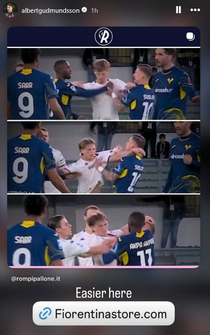 Bæði Albert og Suslov voru reknir af velli í kjölfar atviksins í leik gærdagsins sem að lauk með 1-0 sigri Fiorentina. Verona fékk aukaspyrnu rétt fyrir utan teig Fiorentina og fannst leikmönnum liðsins að Albert stæði of nálægt spyrnumönnum Verona. Téður Suslov sem og liðsfélagi hans hjá Verona, Jean-Daniel Akpro mættu til þess að færa Albert aftar en áttu ekki erindi sem erfiði og fóru hlutirnir fljótlega úr böndunum. Treyja Alberts rifnaði meðal annars í látunum. Það var Albert sem fer sigri hrósandi frá leiknum ásamt liðsfélögum sínum og hann sendi létt skot á Suslov á samfélagsmiðlinum Instagram í gær þó svo að hann hafi hvergi minnst á Slóvakann. „Auðveldara hérna,“ skrifar Albert við myndaseríu þar sem sjá má Suslov rífa ansi vel í treyju Íslendingsins og skilur Albert eftir hlekk á verslun Fiorentina þar sem kaupa má treyju liðsins merkta honum. Núna er spurningin sú hvort Suslov nýti sér ekki þann góða afslátt sem er á treyju Íslendingsins þessa stundina en treyjur Fiorentina merktar Alberti eru sem stendur á allt að 39 prósent afslætti.