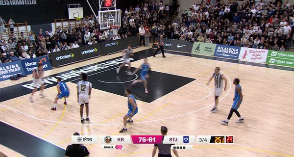 Ægir Þór Steinarsson meiddist illa á olnboga í fjórða leik KR og Stjörnunnar í átta liða úrslitum í kvöld og var fyrirliði Stjörnunnar fluttur í burtu með sjúkrabíl. Stjörnuliðið kom til baka án hans og tryggði sér sæti í undanúrslitunum.